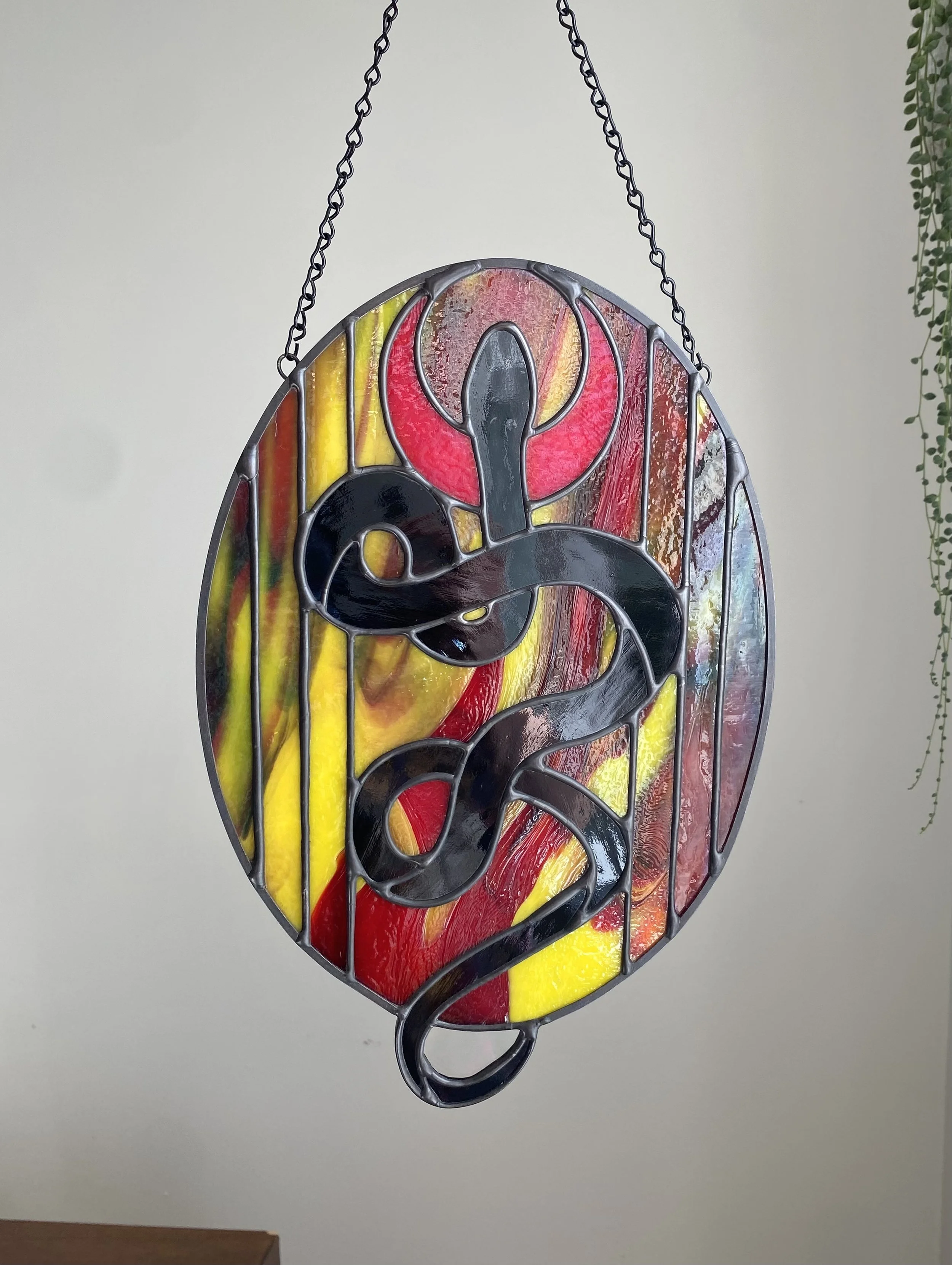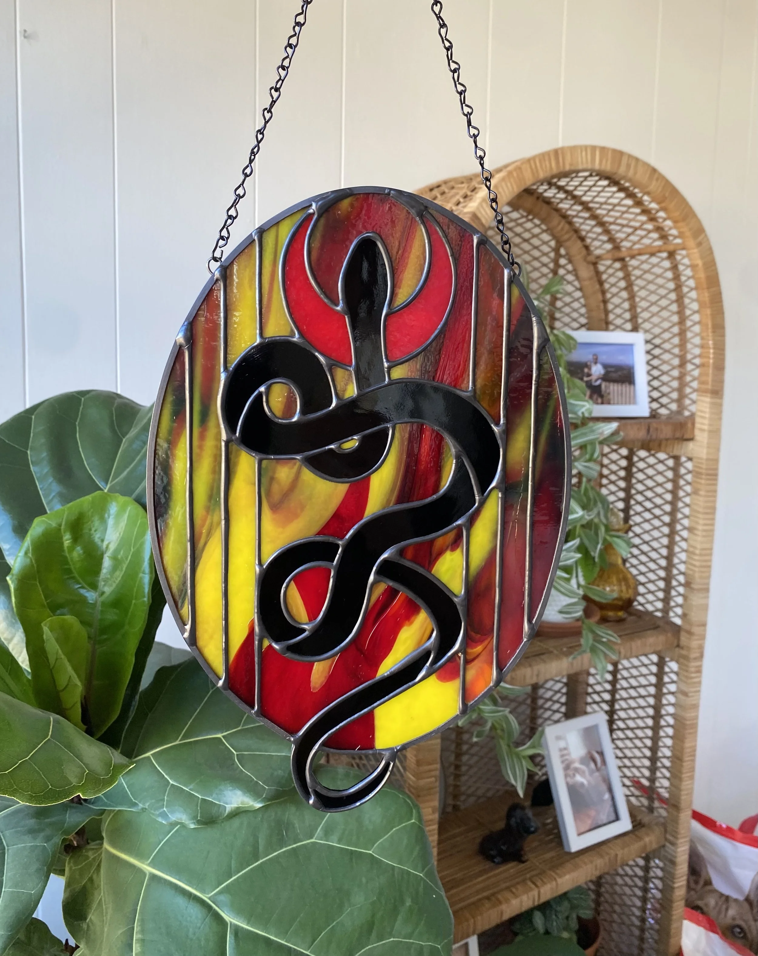 Categories: All SALE Stained Glass Halloween Animals Birds Butterflies Bugs Fantasy Plants Space Prints, Stickers, and More All / Stained Glass / Animals Snake Under the Moon in Fire $175.00 Bunny $165.00